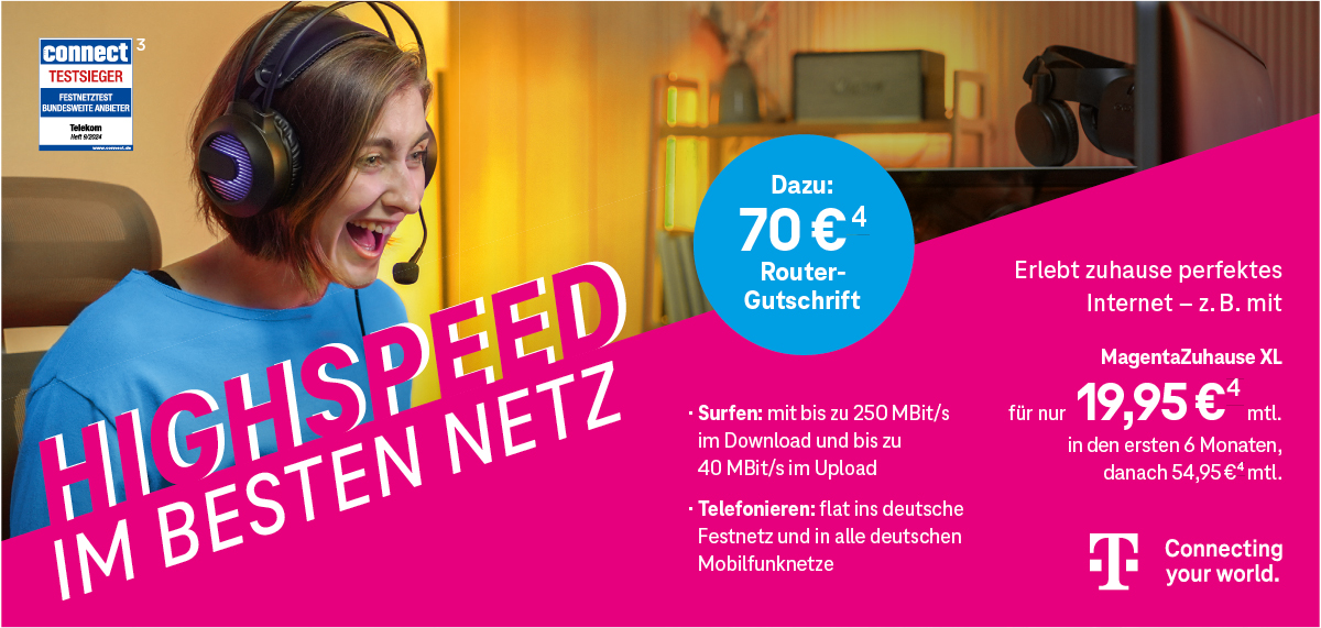 1) Für die Bereitstellung eines Glasfaser-Tarifs ist ein Glasfaser-Hausanschluss erforderlich. Sofern noch nicht vorhanden, wird dieser bei der verbindlichen Buchung eines Glasfaser-Tarifs kostenfrei neu verlegt, vorausgesetzt, die Anschlussadresse für den Tarif ist mit der Adresse des mit Glasfaser anzuschließenden Gebäudes identisch. Die Bereitstellung erfolgt, wenn Hauseigentümer/Hausverwaltung dem Ausbau zustimmen und die finale Prüfung den Ausbau bestätigt. Als Glasfaser-Tarif gilt z. B. Glasfaser 300, in den ersten 6 Monaten für 19,95 €/Monat, danach für 49,95€/Monat. Einmaliger Bereitstellungspreis für neuen Telefonanschluss 69,95 €. Mindestvertragslaufzeit 24 Monate. Durch Eingabe einer Adresse auf der Internetseite telekom.de/glasfaser kann geprüft werden, ob diese in einem Glasfaser-Ausbaugebiet liegt. 2) connect Breitband- und Festnetztest, Heft 09/2024, Testsieger/sehr gut „Festnetztest bundesweite Anbieter“. Glasfaser-Tarife waren nicht Gegenstand des Netztests.Ein Angebot von: Telekom Deutschland GmbH, Landgrabenweg 151, 53227 Bonn.3) connect Breitband- und Festnetztest, Heft 09/2024, Testsieger/sehr gut „Festnetztest bundesweite Anbieter“. MagentaZuhause war nicht Gegenstand des Netztests. 4) Aktion gilt bis 03.02.2025 für Breitband-Neukunden, die in den letzten 3 Monaten keinen Breitbandanschluss bei der Telekom hatten. MagentaZuhause XL kostet in den ersten 6 Monaten 19,95 €/Monat, danach 54,95 €/Monat. Bei Miete eines Routers im Endgeräte-Service-Paket (ab 6,95 €/Monat) erfolgt eine Router-Gutschrift i. H. v. 70 €. Hardware zzgl. 6,95 € Versandkosten. Einmaliger Bereitstellungspreis für neuen Telefonanschluss 69,95 €. Mindestvertragslaufzeit für MagentaZuhause 24 Monate, für den Router 12 Monate. MagentaZuhause XL ist in vielen Anschlussbereichen verfügbar. Ein Angebot von: Telekom Deutschland GmbH, Landgrabenweg 151, 53227 Bonn.