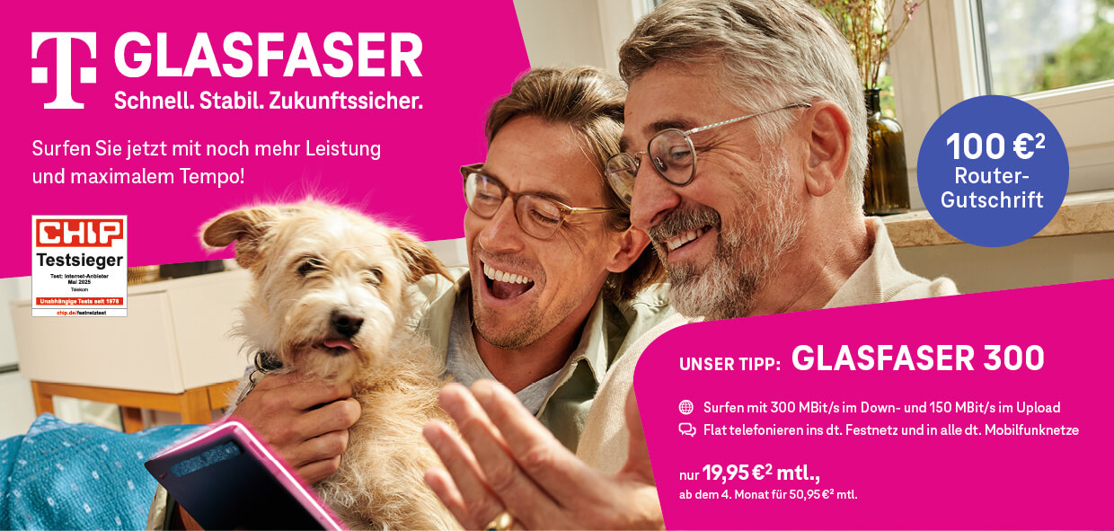 2) Aktion gilt bis 02.02.2026 für Breitband-Neukunden, die in den letzten 3 Monaten keinen Breitbandanschluss bei der Telekom hatten. Glasfaser 300 kostet in den ersten 3 Monaten 19,95 €/Monat, danach 50,95 €/Monat. Bei Miete eines Routers im Endgeräte-Service-Paket (i. H. v. 7,95 €/Monat) erfolgt eine Router-Gutschrift i. H. v. 100 €. Hardware zzgl. 6,95 € Versandkosten. Der einmalige Bereitstellungspreis für einen neuen Telefonanschluss beträgt 69,95 €. Die Mindestvertragslaufzeit für Glasfaser 300 beträgt 24 Monate, für Hardware 12 Monate. Alle Preise inkl. der gesetzlichen MwSt. Für die Bereitstellung von Glasfaser 300 ist ein Glasfaser-Hausanschluss erforderlich. Sofern noch nicht vorhanden, wird dieser bei einer verbindlichen Buchung des Tarifs Glasfaser 300 neu verlegt, vorausgesetzt, die Anschlussadresse für den Tarif ist mit der Adresse des mit Glasfaser anzuschließenden Gebäudes identisch. Die Bereitstellung erfolgt, wenn Hauseigentümer/Hausverwaltung dem Ausbau zustimmen und die finale Prüfung den Ausbau bestätigt. Durch Eingabe einer Adresse auf der Internetseite telekom.de/glasfaser kann geprüft werden, ob diese in einem Glasfaser-Ausbaugebiet der Deutschen Telekom liegt.
